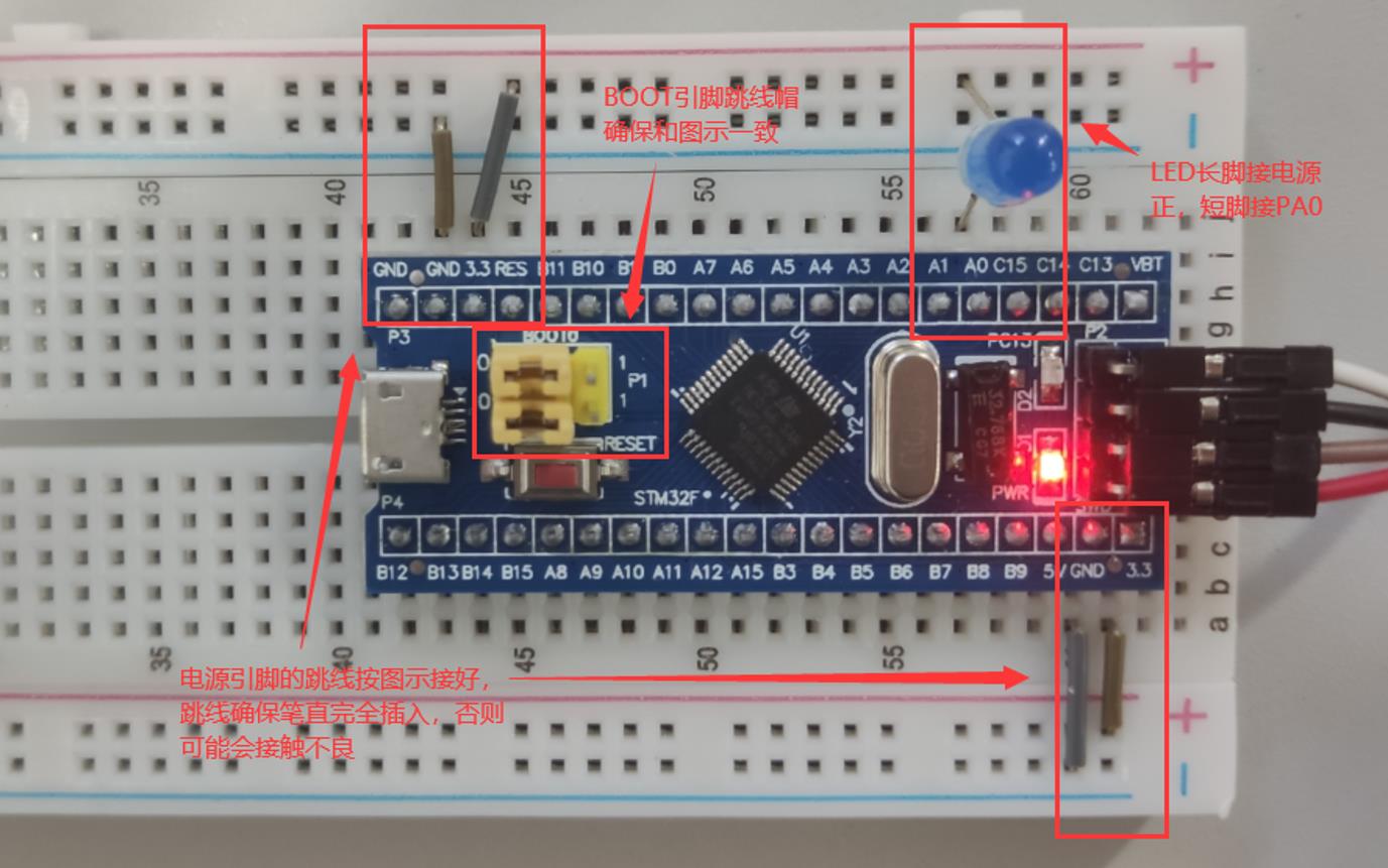 常见易错点:LED正负极接错,正确接法是:LED长脚接电源正,短脚接PA0。